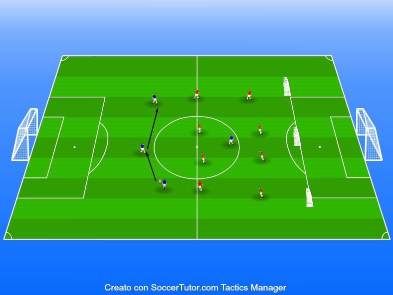 În fața mijlocașilor se află trei jucători (albastru) care au ca scop transmiterea mingii din dreapta spre stânga și invers, în timp ce un al 4-lea jucător albastru se mișcă liber între liniile jucătorilor în roșu. Exercițiul începe cu pasele successive a celor 3 jucători albastri care, în momentul în care găsesc timp și spațiu, trebuie să transmită pasă celui de-al 4-lea jucător. Acesta are ca scop finalizarea acțiunii prin trimiterea mingii în una din cele trei portițe de pe linia careului de 16m advers. Fundașii trebuie să urmărească deplasarea mingii, să păstreze distanțe optime între ei, să rămână compacți și organizați și să reacționeze prompt pentru a reduce timpul și spațiul adversarului în momentul transmiterii pasei verticale. |