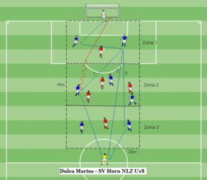 Zona 1 –zona inițială a exercițiului cuprinde în atac (construcție) 2 fundași centrali plus un portar contra unui atacant central.