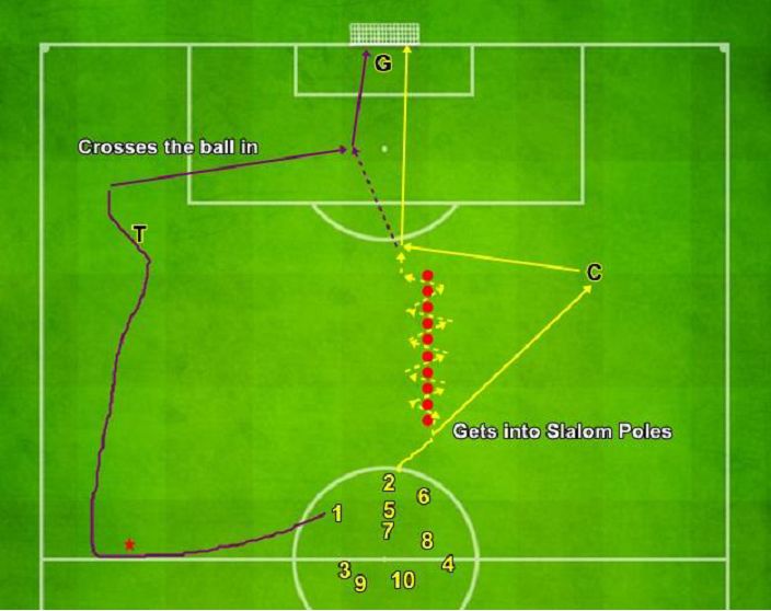 - La fel, fundașii pot juca direct in Zona 3, trecând peste Zona 2 (zona de pressing ), pentru o situație 2v1, dar mingea nu poate ajunge la jucătorul Target (Galben) dacă nu s-au realizat minim 2 pase de către jucătorii în superioritate 2 V 1