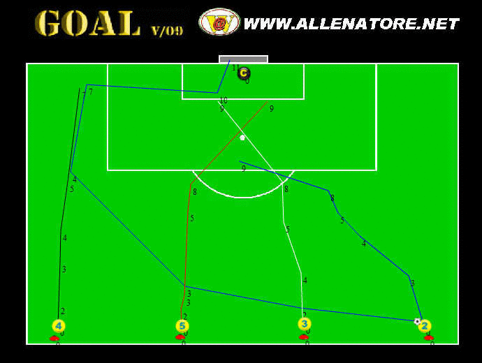Se înfruntă două echipe a câte 7 jucători fiecare, Roșu și Albastru, plus 2 portari. Exercițiul începe în zona delimitată mediană, unde se joacă liber ca număr de atingeri, fiecare echipă încercând să conserve posesia.