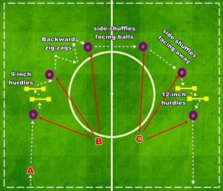 Exercitiile PROFESSIONAL FOOTBALL AND SOCCER COACHING Acest exercitiu ajuta portarii sa salveze suturi consecutive, adresindu-se abilitatii tehnice a acestora. Intreg exercitiul se adreseaza lucrului pentru picioare si abilitatilor tehnice. Suprafata de lucru se aseamana cu o o cursa de obstacole in care fiecare portar, de-a lungul acesteia, respinge mingi la anumite intervale. Miscari variate, pozitia…