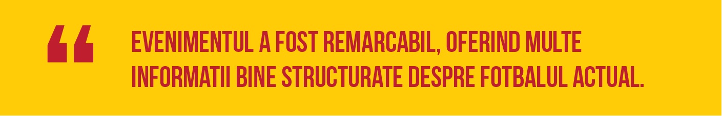 ” Doresc sa-i felicit in primul rand, pe cei doi creatori ai acestui seminar de perfectionare pentru antrenori, Ciprian Urican si Massimo Lucchesi, pentru profesionalismul lor. Din punctul meu de vedere evenimentul a fost remarcabil, oferind multe informatii bine structurate despre fotbalul actual. Sper ca dupa acest eveniment, sa constientizam ca trebuie sa ne schimbam,…