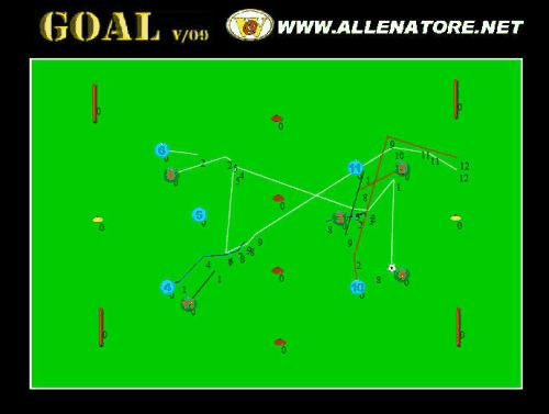 – Joc „linie – gol” – 5×5 jucatori – suprafata 40/30m – in jumatatea proprie de teren stau 3 jucatori (fundasi), in jumatatea adversa stau 2 atacanti care nu au voie sa treaca linia de mijloc – fundasii au doua atingeri, atacantii numar nelimitat, incurajind astfel driblingul – punctul este valabil dupa ce fundasii paseaza…
