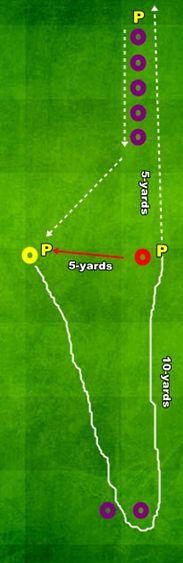 – Imediat ce jucatorul a ocolit jalonul, antrenorul ii arunca mingea facindu-l sa o controleze dintr-o atingere si sa accelereze in momentul urmator