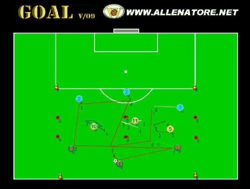 Exercitiu de posesie a mingii in careu Intr-un careu de 20/10m sint 3 echipe in trei culori. Se incearca posesia 6v3 (2 echipe contra 1). Daca mingea este recuperata de echipa din centru sau mingea este scoasa din suprafata de joc, echipa care a gresit intra in mijloc, la recuperare. Timp de exersare: 15 minute.
