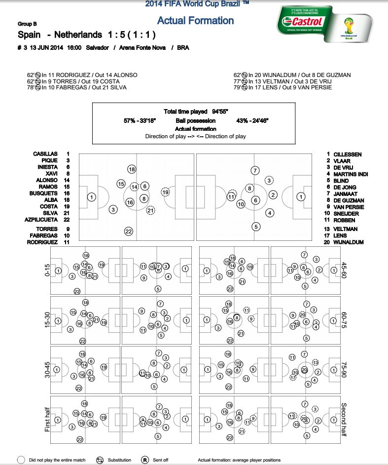 „coaches-ahead.ro/” va ofera statisticile jocurilor de la Cupa Mondiala din Brazilia 2014, materiale utile pentru toti iubitorii fotbalului. Iata statistica meciului Spania – Olanda, din prima etapa a grupei B.