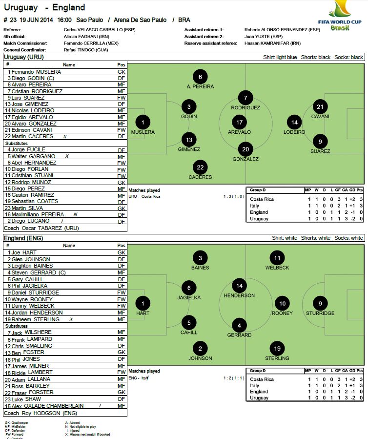 „coaches-ahead.ro/” va ofera statisticile jocurilor de la Cupa Mondiala din Brazilia 2014, materiale utile pentru toti iubitorii fotbalului. Iata statistica meciului Uruguay – Anglia 2-1