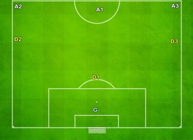 – 3 atacanti (A1, A2, A3) 3 fundasi (D1, D2, D3) plus 1 portar