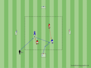 • Exploatează superioritatea numerică obținută 3v2 în faza de start joc apoi continuarea 2v1 în faza de dispunere pozițională împotriva fundașului lateral advers.