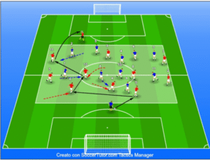 Obiectivul acestui exercițiu este de a stimula continua presiune asupra posesorului mingii și a colegilor din apropierea lui.