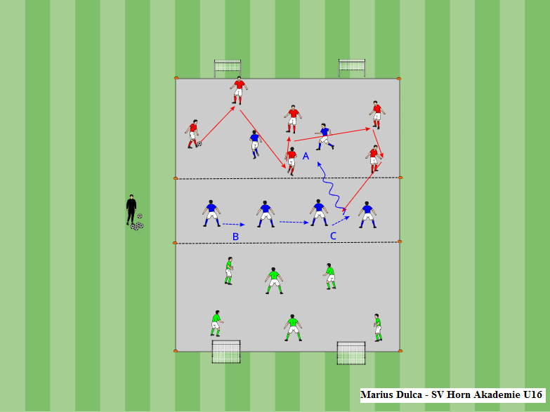 Organizarea exercitiului: Intr-un teren de 50 x 25 m se delimiteaza o zona mediana de 10 m. Pe fiecare latura in adamcime se fixeaza cate 2 porti mici. Antrenorii sunt plasati in imediata apropiere a suprafetei de joc având multe mingi de rezerva la îndemână pentru continuitate in joc. Se impart jucatorii in 3…