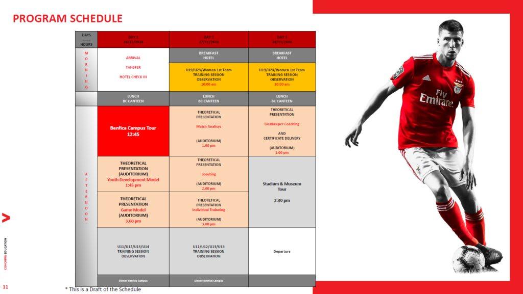 Cursul are obiectivul de a aprofunda filozofia și metodologia utilizate de clubul portughez, prin intermediul unor serii de lecții în auditorium și vizionarea antrenamentelor copiilor din sectorul juvenil.