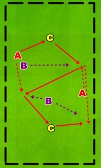 Exercițiul începe cu portarul care pasează unuia dintre atacanții săi care îi returnează balonul. Portarul lansează extrema dreaptă, care este urmărită de jucătorul albastru de pe partea sa..