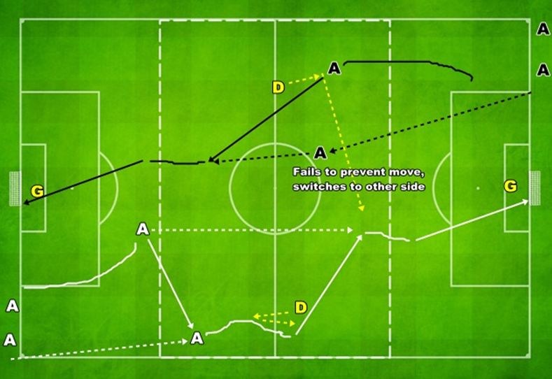 – Atacantii pornesc din ambele parti ale terenului fortind fundasii sa aleaga intre a ramine 1 v 2 sau a efectua dublajul colegului (deci fundasii au voie sa se acopere!)