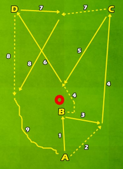 – B ii returneaza lui A (3) si se intoarce in jurul conului (4) in timp ce A ii transmite mingea C (deasemenea 4)
