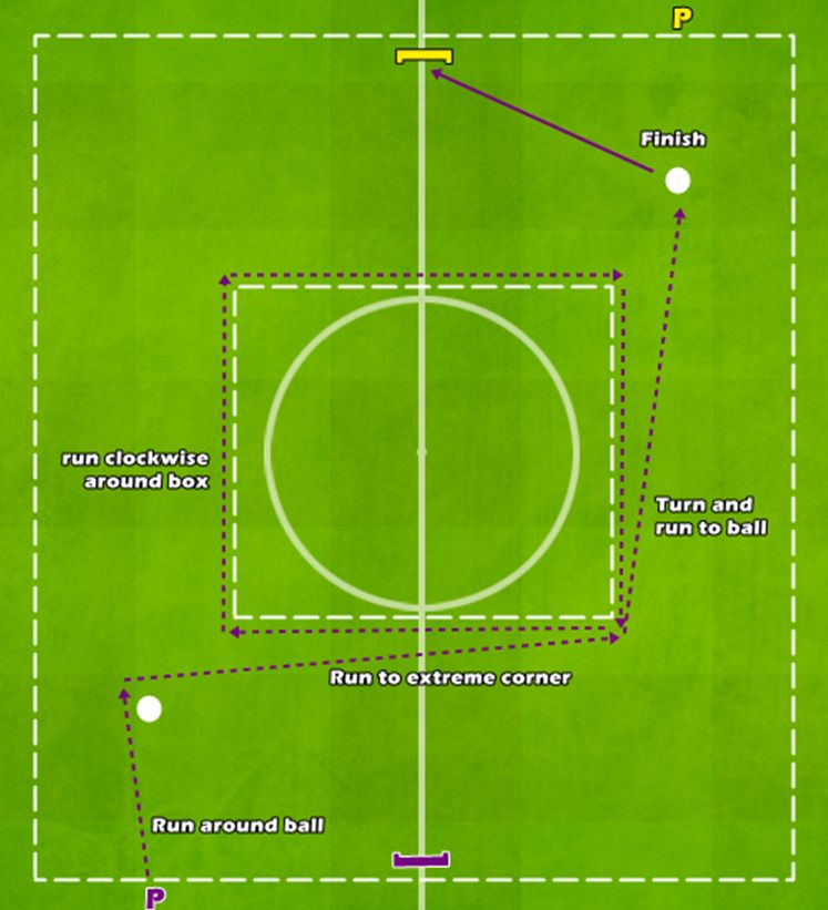 – Dupa ce inconjoara careul, alearga cu mingea in partea opusa si finalizeaza la portita mica