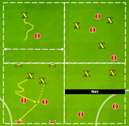 Suprafata: un dreptunghi de 30/12m, impartit in doua suprafete egale Nr. jucatori: 3 echipe de 3 jucatori + 2 jolly Descriere: – doua echipe de 3 jucatori se aseaza pe laturi, cite una intr-un careu, cu scopul da a face posesie, fiind ajutati de cei doi jolly, fiecare jucind in careul sau – jocul incepe…